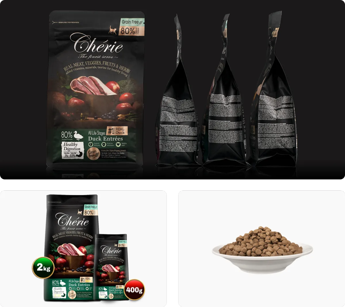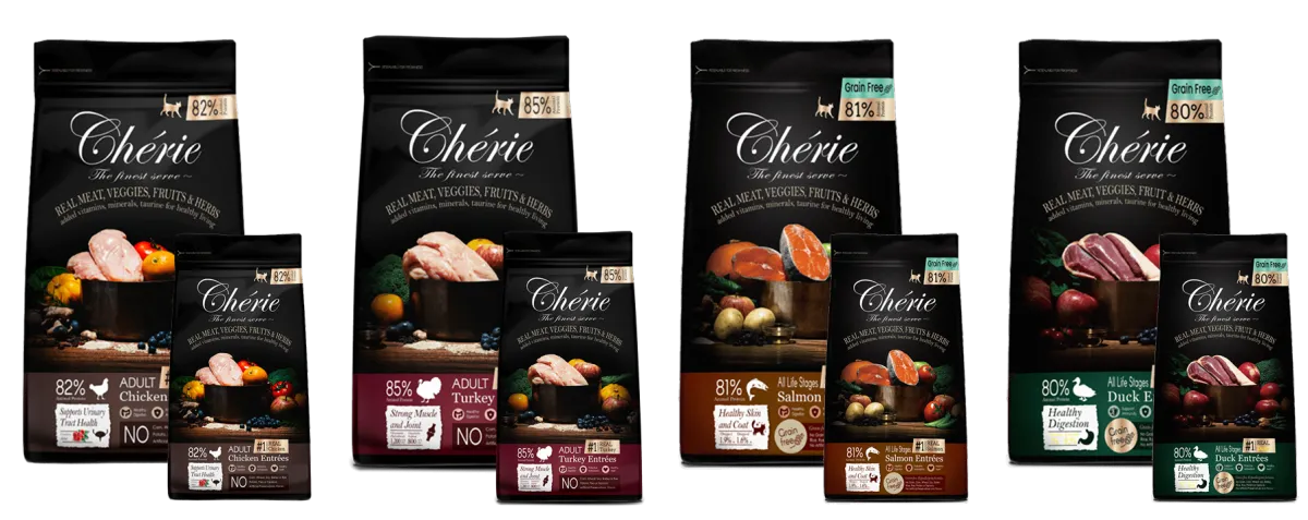 Grain-Free, low allergy formula Healthy food starts with good ingredients. We use Real Duck as #1 ingredient for Chèrie Grain free - All Life Stages Duck Entrées. 80% of protein comes from animal ingredients. The recipe uses Real Duck blended with fruits, vegetables, herbs and necessary nutrition in a mix of tasty bites that your cats will love.
