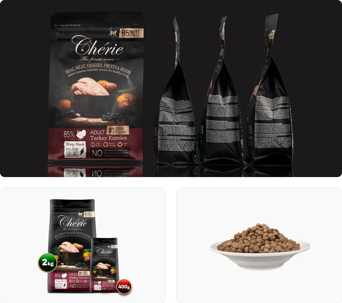 Our recipe for health Healthy food starts with good ingredients. We use Real Turkey as #1 ingredient for Chèrie Turkey Entrées. 85% of protein comes from animal ingredients. The recipe uses Real Meat blended with fruits, vegetables, herbs and necessary nutrition in a mix of tasty bites that your cats will love.