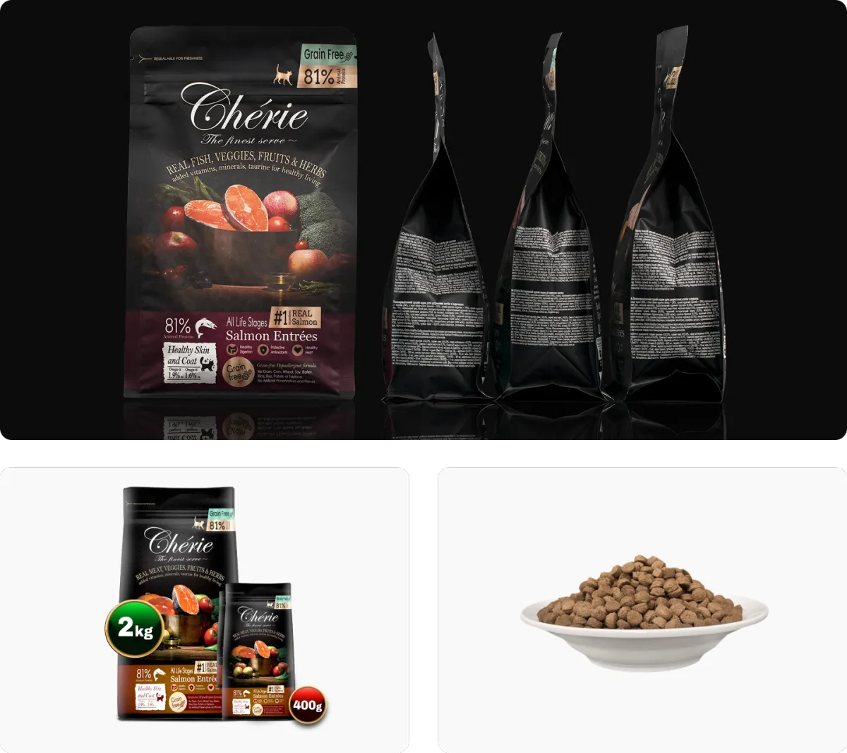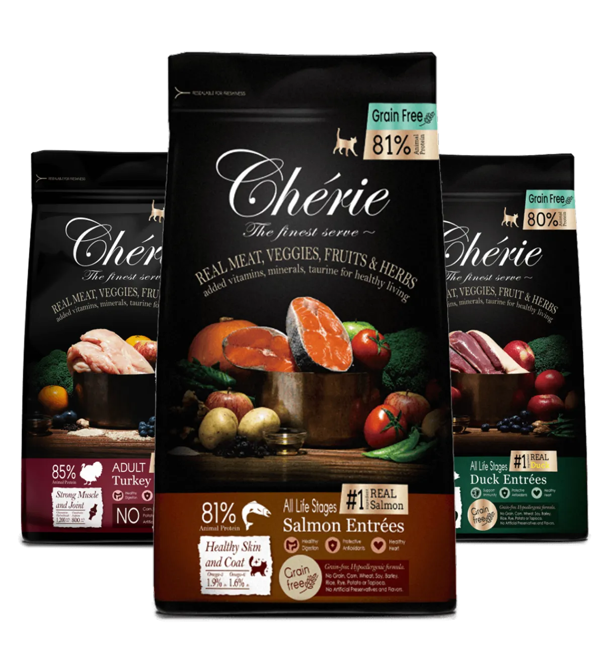 Grain-Free, low allergy formula Healthy food starts with good ingredients. We use Real Salmon as #1 ingredient for Chèrie Grain free - All Life Stages Salmon Entrées. 80% of protein comes from animal ingredients. The recipe uses Real Salmon blended with fruits, vegetables, herbs and necessary nutrition in a mix of tasty bites that your cats will love.
