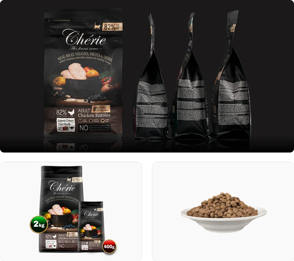 Our recipe for health Healthy food starts with good ingredients. We use Real Chicken as #1 ingredient for Chèrie Chicken Entrées. 85% of protein comes from animal ingredients. The recipe uses Real Meat blended with fruits, vegetables, herbs and necessary nutrition in a mix of tasty bites that your cats will love.