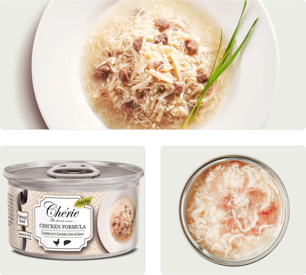 Delicious mix of chicken with chicken liver in sauce makes for an appetizing treat for your fluffy friend. The natural flavor and delicious Chérie sauce offer a luxurious taste experience for cats.
