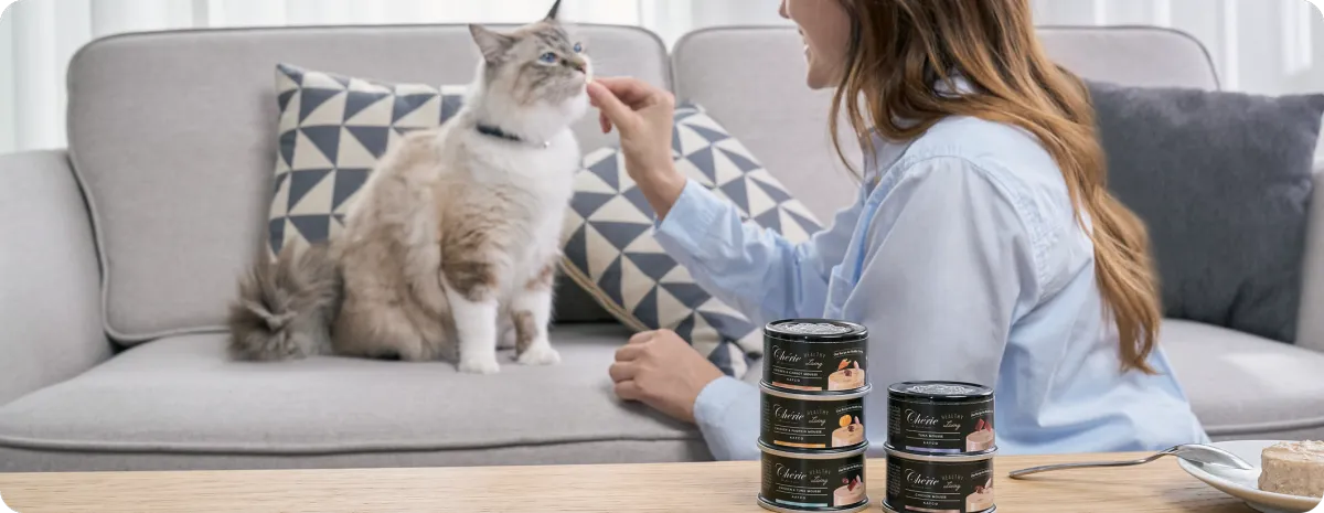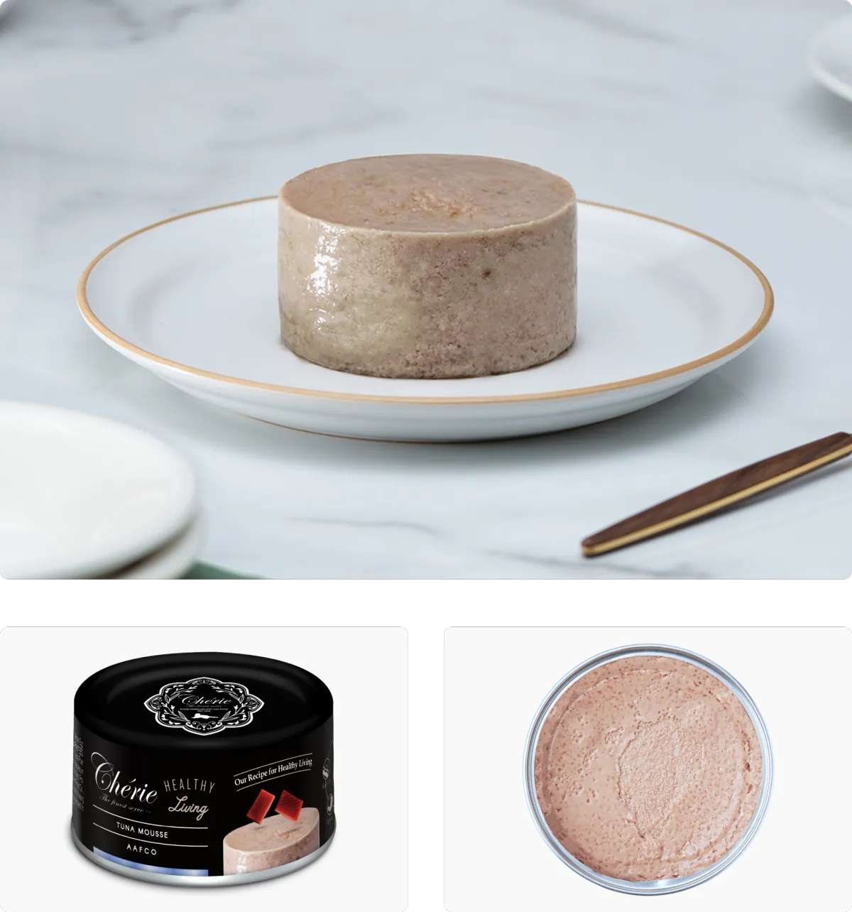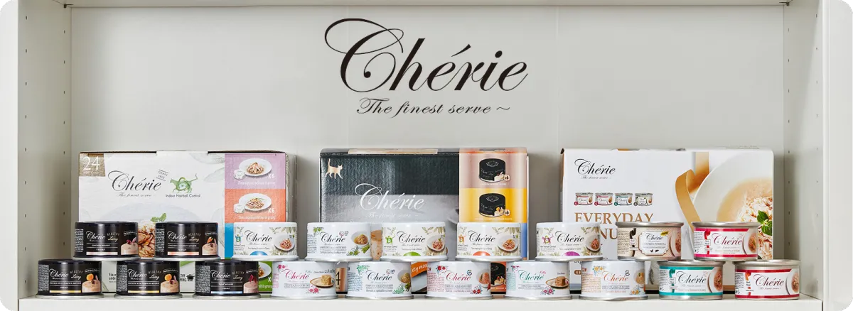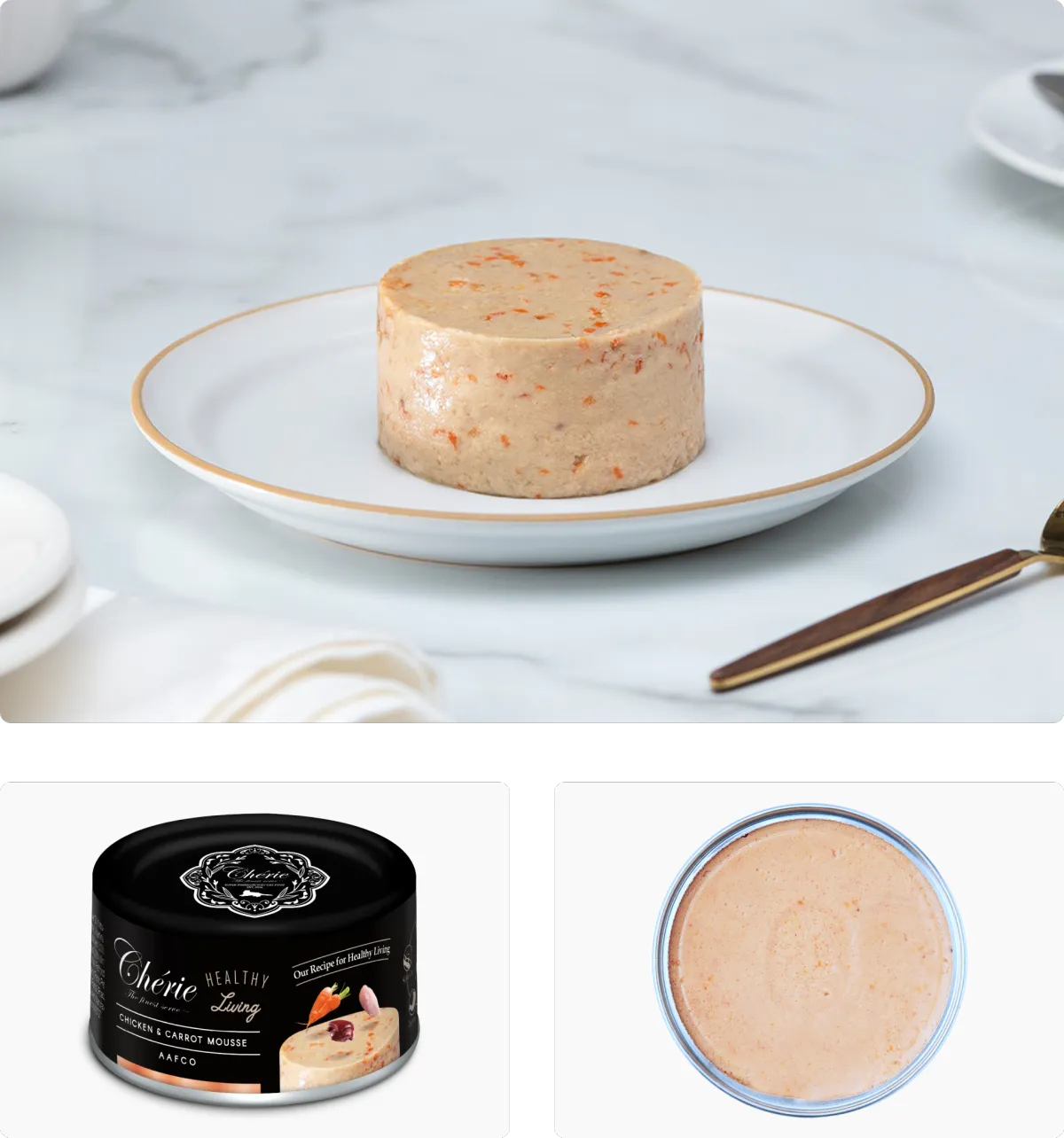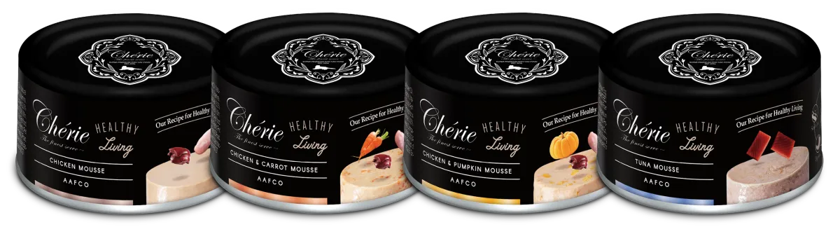 The product line "Chérie Healthy Living Series" - mousses made from fresh meat and fish, which are delicious for both small kittens and adult gourmet cats due to their velvety texture. They support digestion, strong teeth, healthy fur, as well as heart and kidney function.