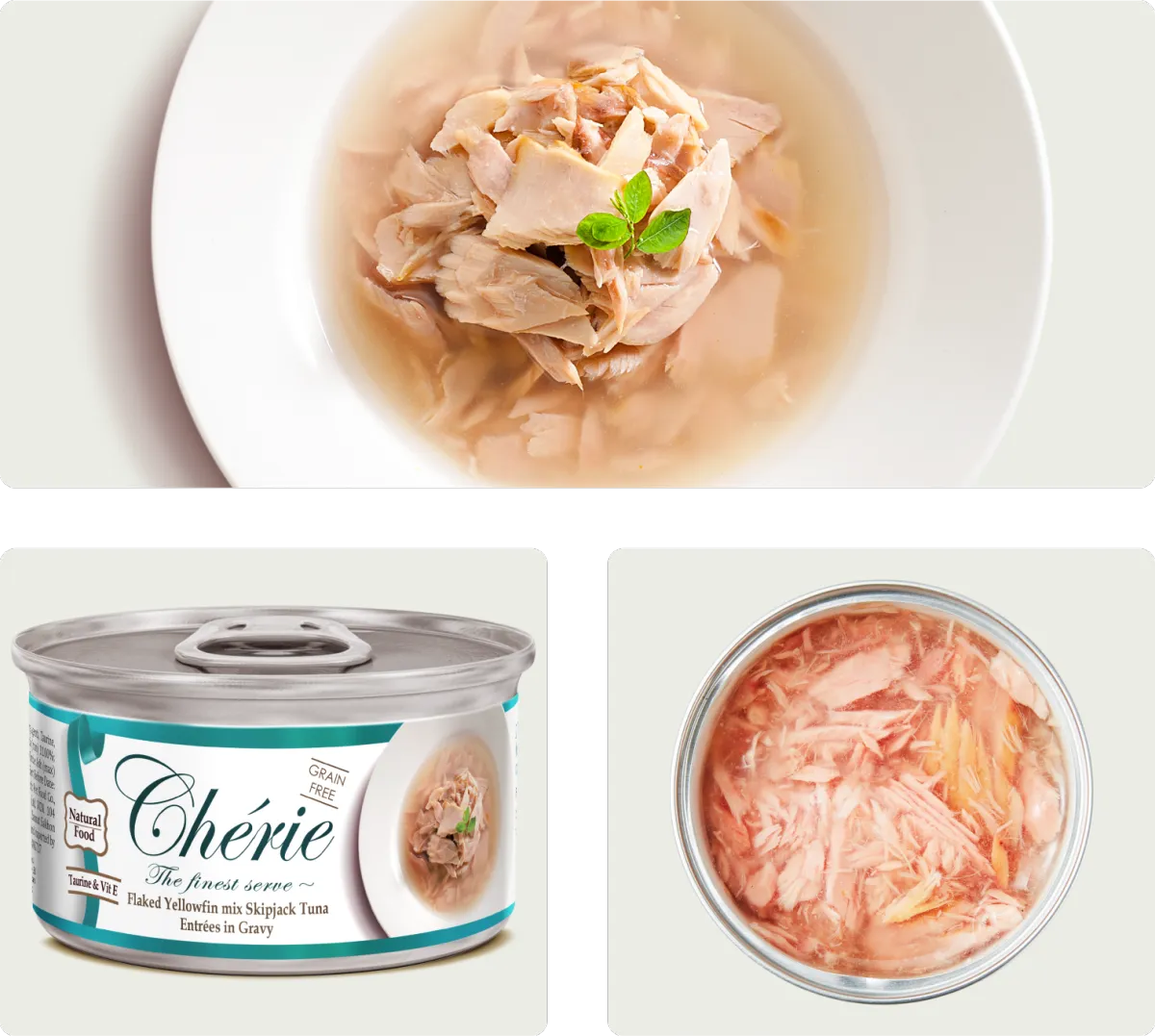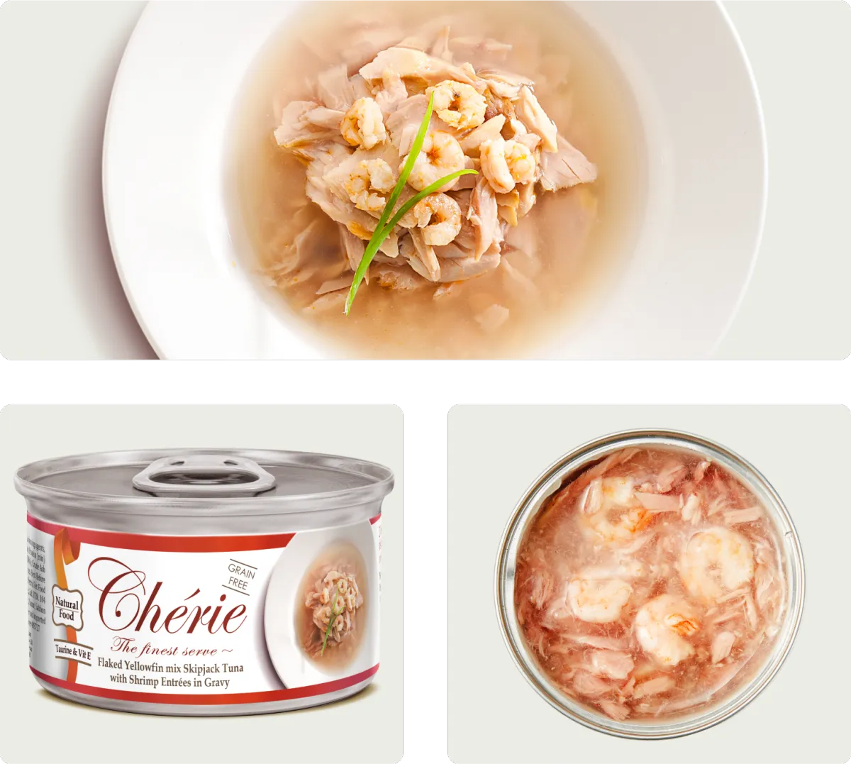 Delicious mix of yellowfin tuna, skipjack tuna, and shrimp in sauce makes for an appetizing treat for your fluffy friend. The natural flavor and delicious Chérie sauce offer a luxurious taste experience for cats.