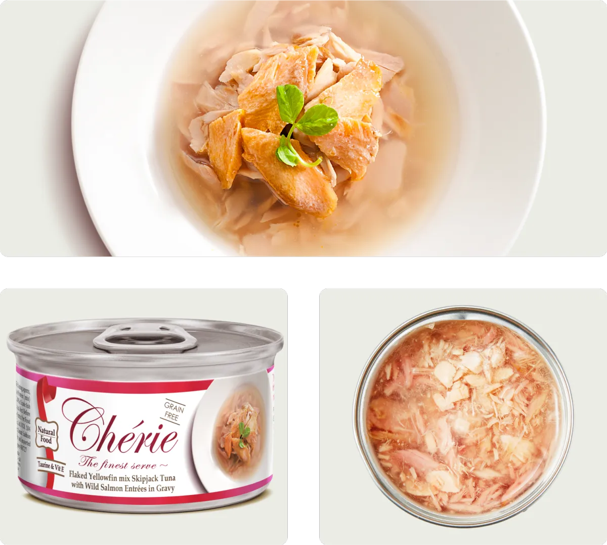 Delicious mix of tuna and wild salmon in sauce makes for an appetizing treat for your fluffy friend. The natural flavor and delicious Chérie sauce offers a luxurious taste experience for cats.