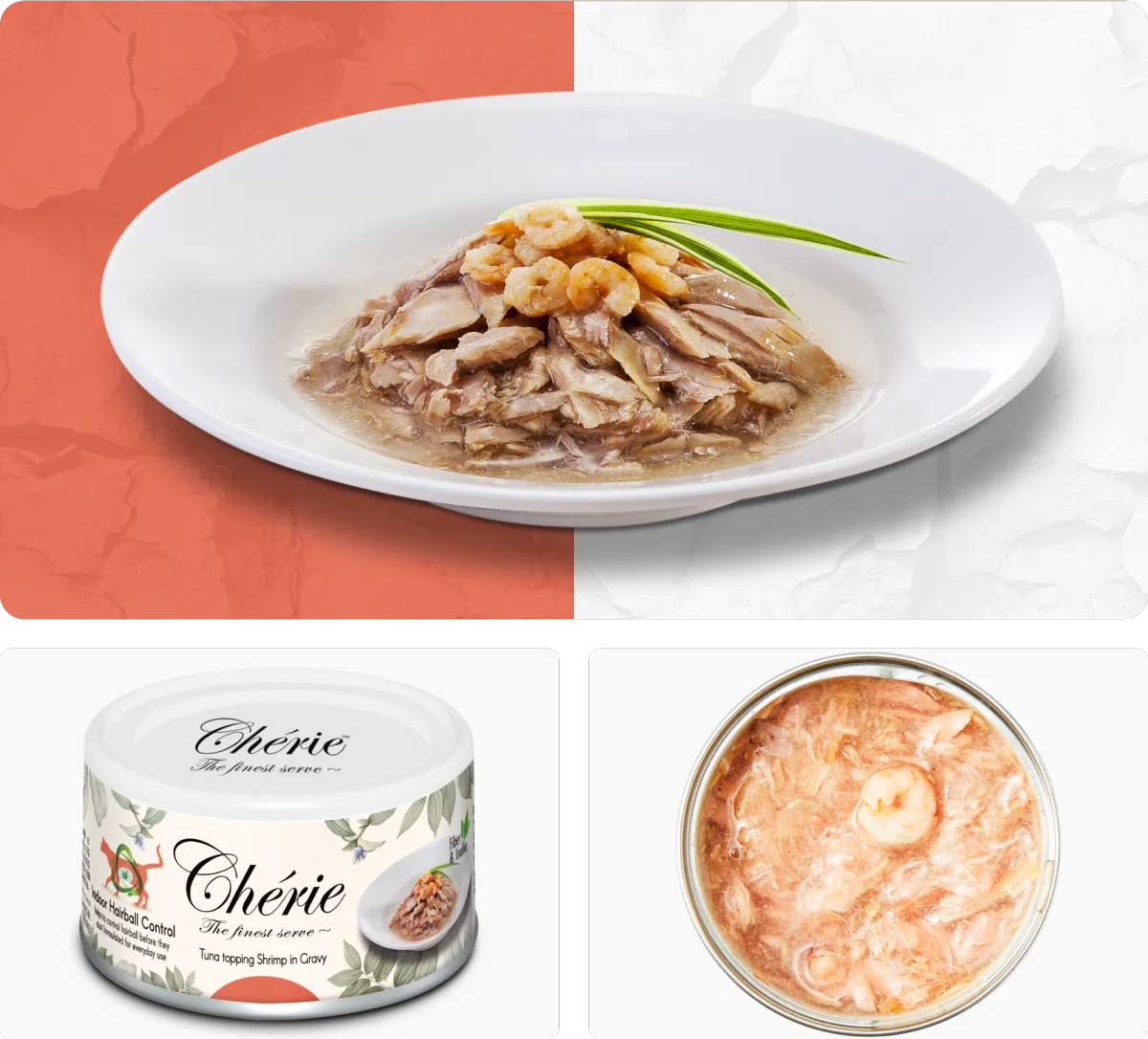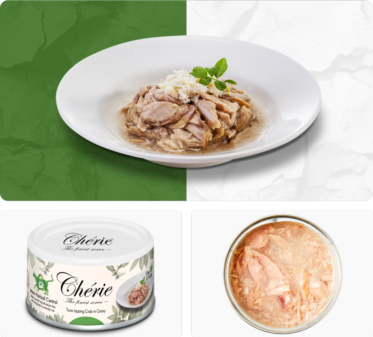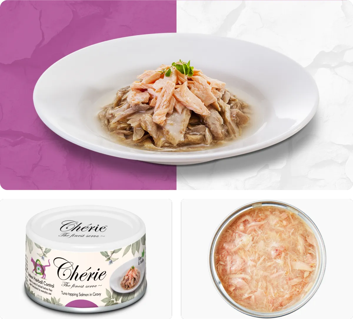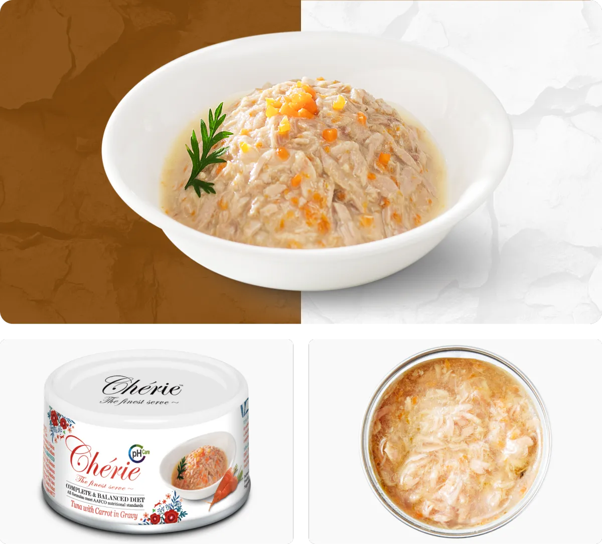 Tender tuna with pieces of natural carrot in Chérie's signature sauce.