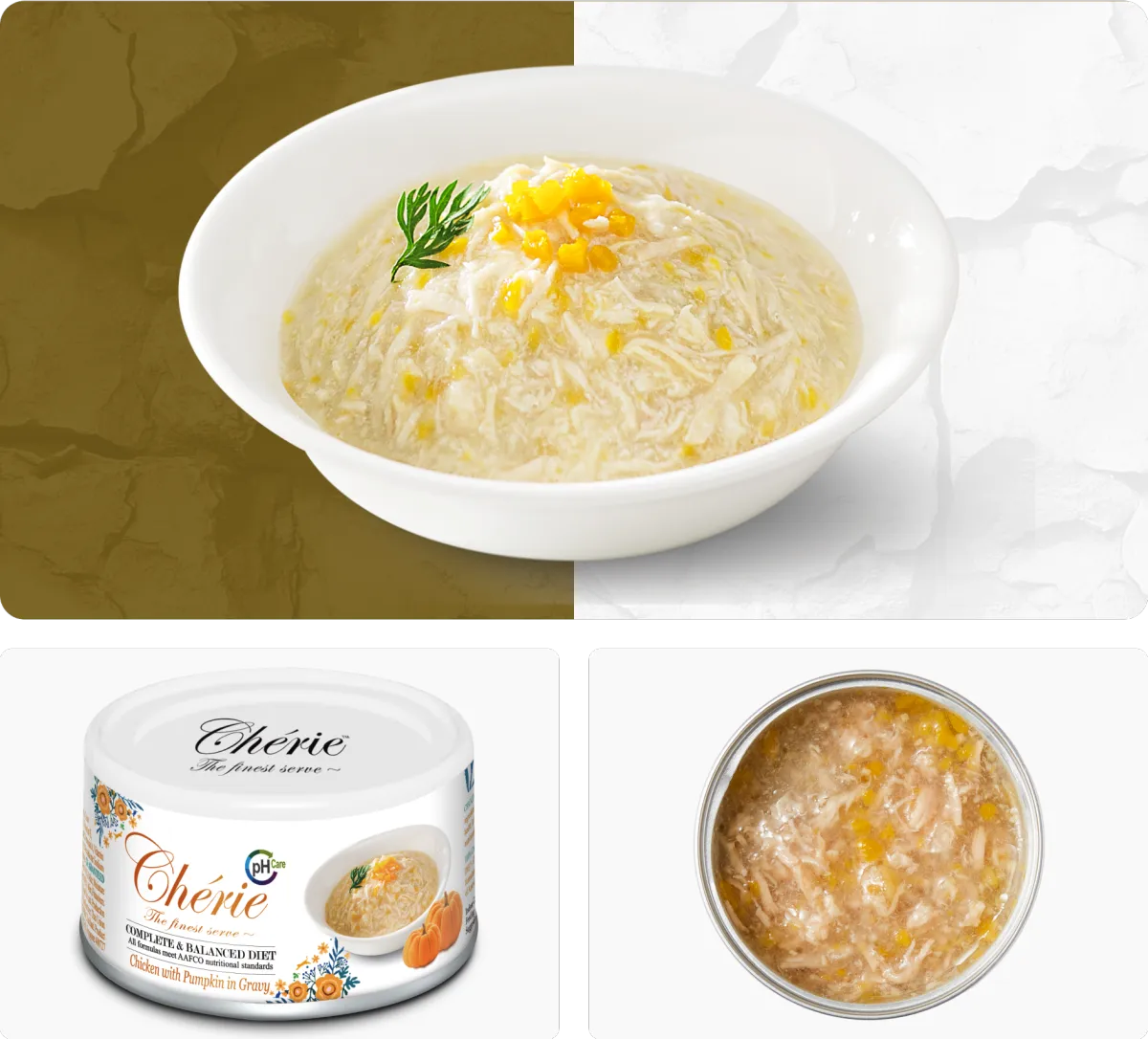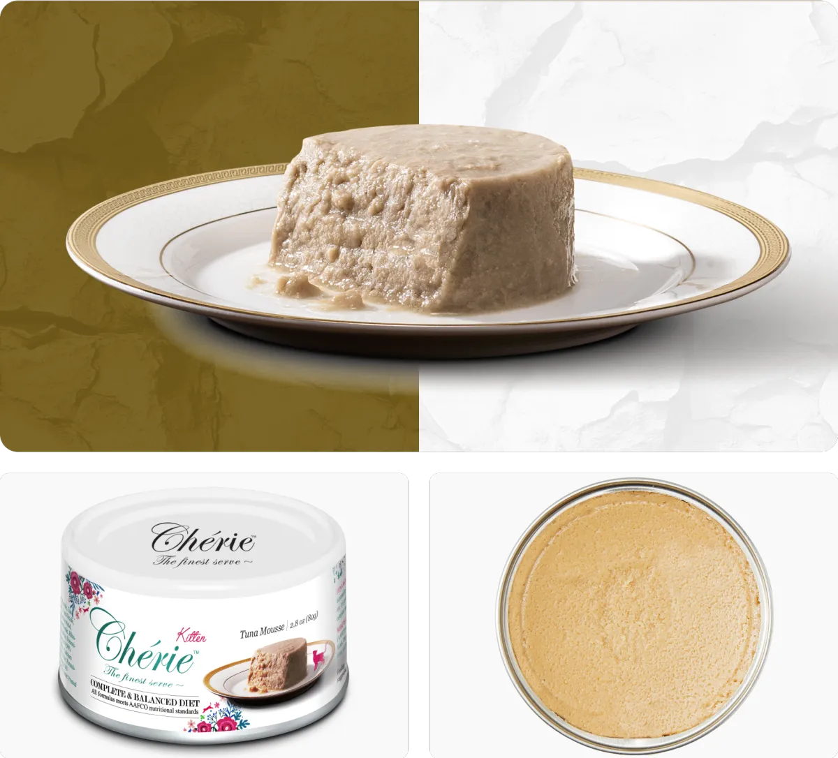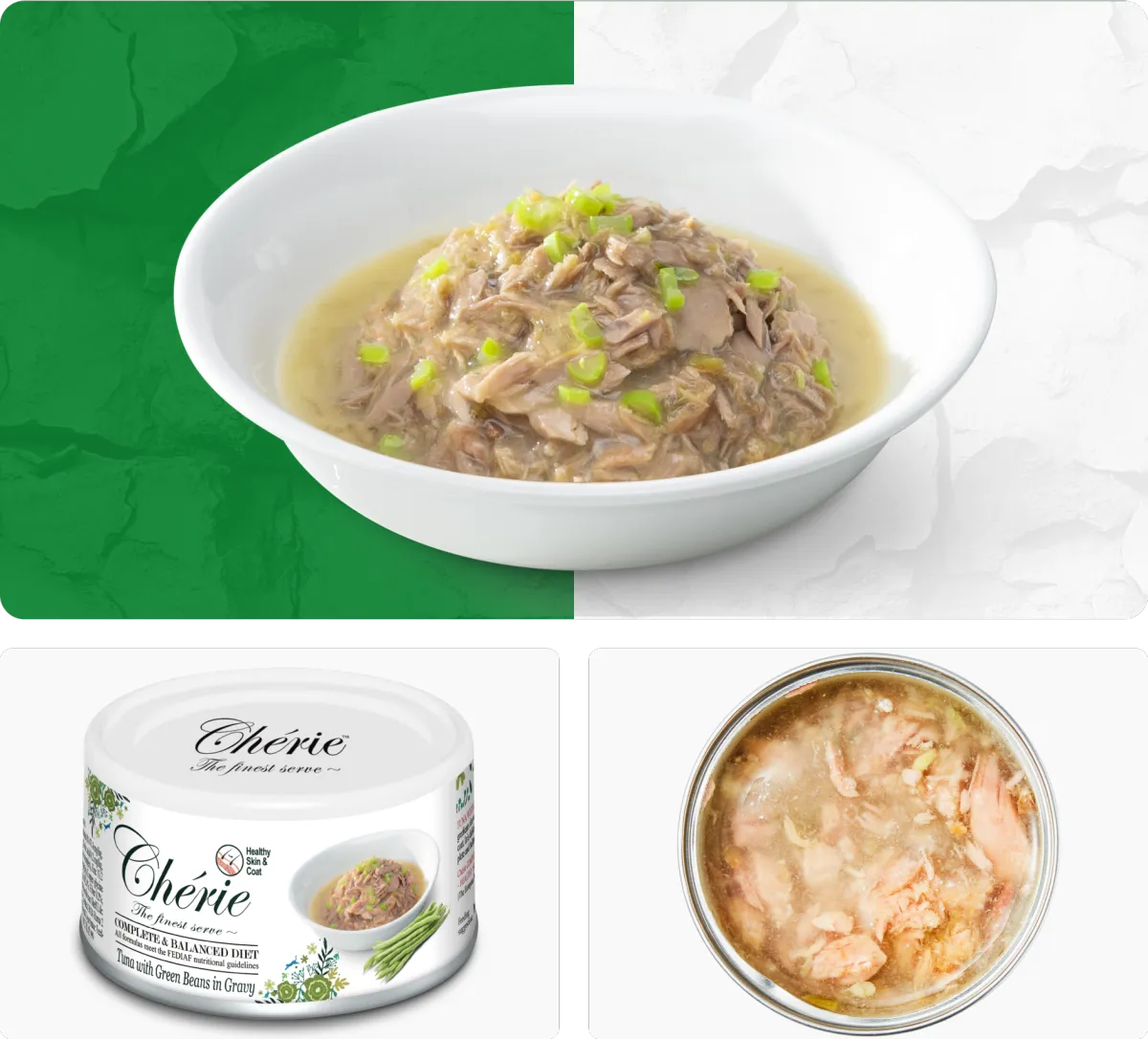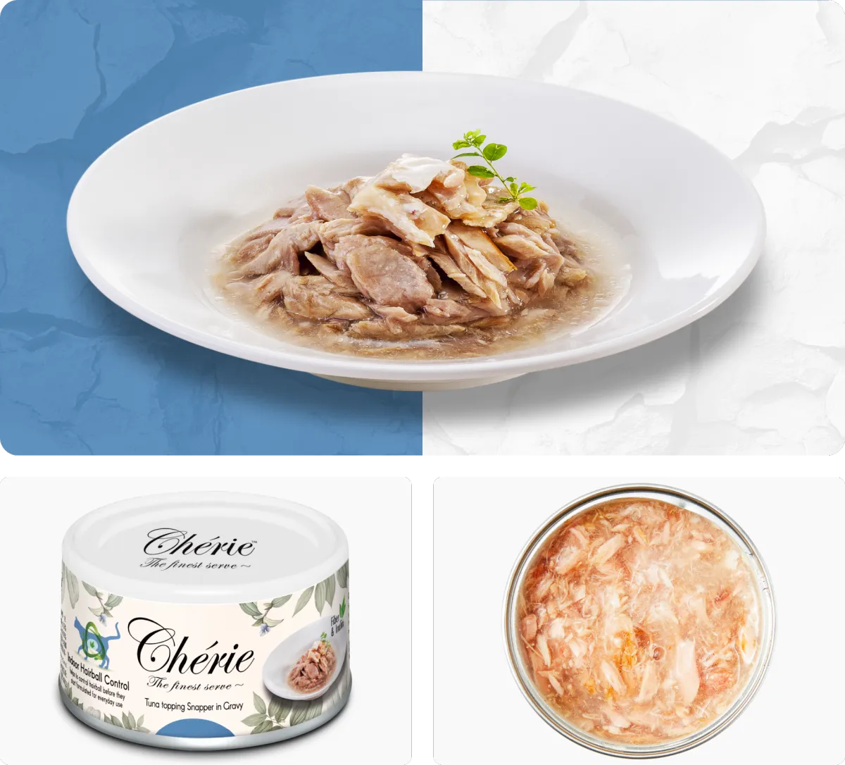 Tender tuna with pieces of natural carrot in Chérie's signature sauce.