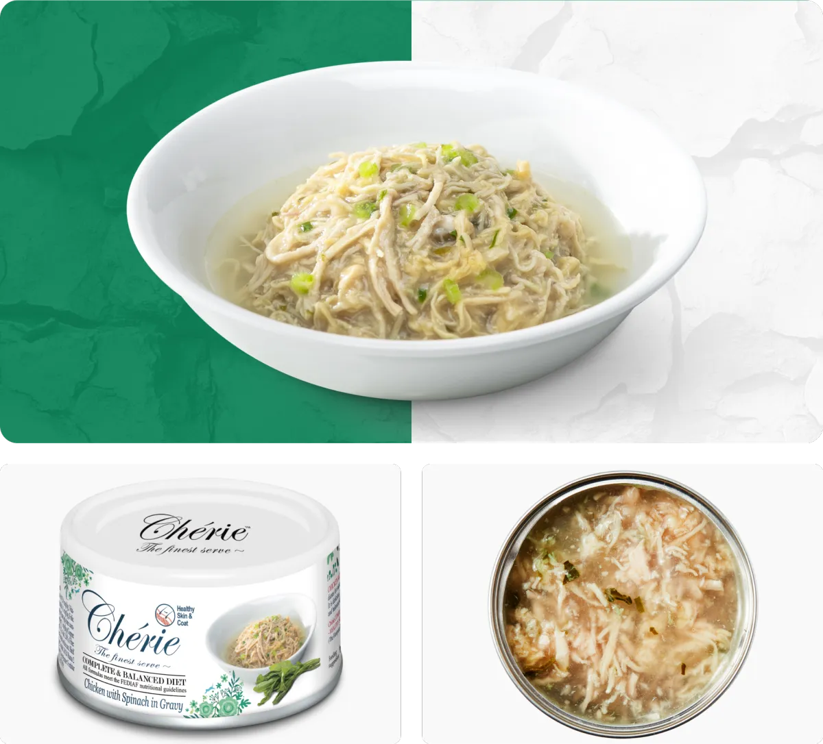 Tender pieces of white chicken with spinach in Chérie’s signature sauce.
