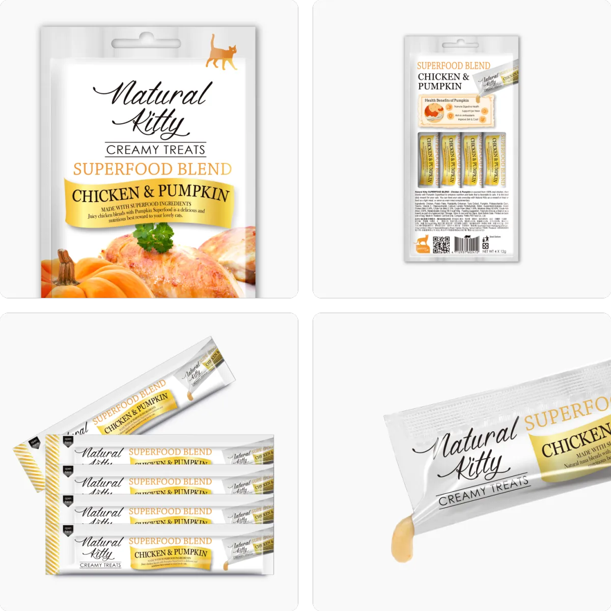 Chicken & Pumpkin is sourced from 100% real chicken, then blends with Pumpkin Superfood to enhance nutrition and taste that is favorable to cats. It is the best daily reward for your cats. You can feed your cats everyday with Natural Kitty as a reward or treat or feed as a light meal, or serve as main meal complementary.