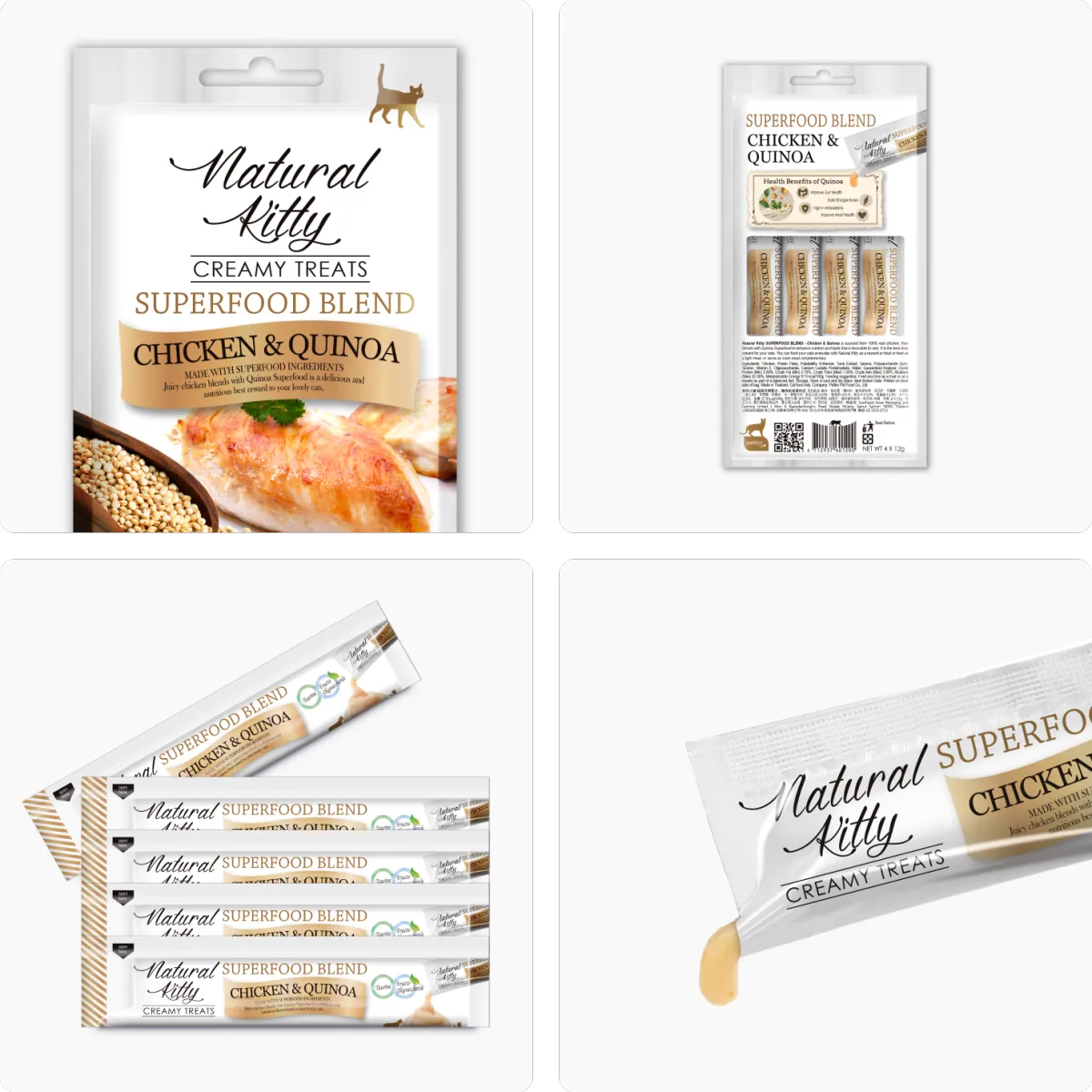 Chicken & Quinoa is sourced from 100% real chicken, then blends with Quinoa Superfood to enhance nutrition and taste that is favorable to cats. It is the best daily reward for your cats. You can feed your cats everyday with Natural Kitty as a reward or treat or feed as a light meal, or serve as main meal complementary.
