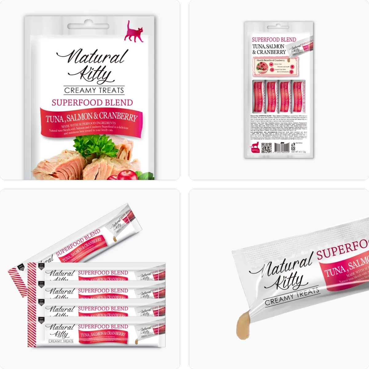 Tuna, Salmon & Cranberry is sourced from 100% real tuna and salmon, then blends with Cranberry Superfood to enhance nutrition and taste that is favorable to cats. It is the best daily reward for your cats. You can feed your cats everyday with Natural Kitty as a reward or treat or feed as a light meal, or serve as main meal complementary.