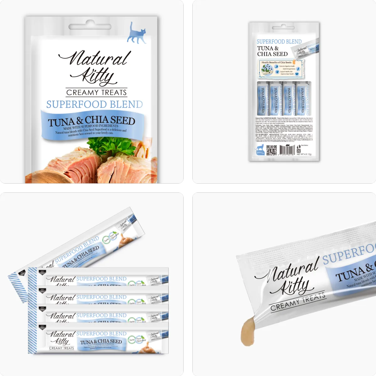 Tuna & Chia Seed is sourced from 100% real tuna, then blends with Chia Seed Superfood to enhance nutrition and taste that is favorable to cats. It is the best daily reward for your cats. You can feed your cats everyday with Natural Kitty as a reward or treat or feed as a light meal, or serve as main meal complementary.