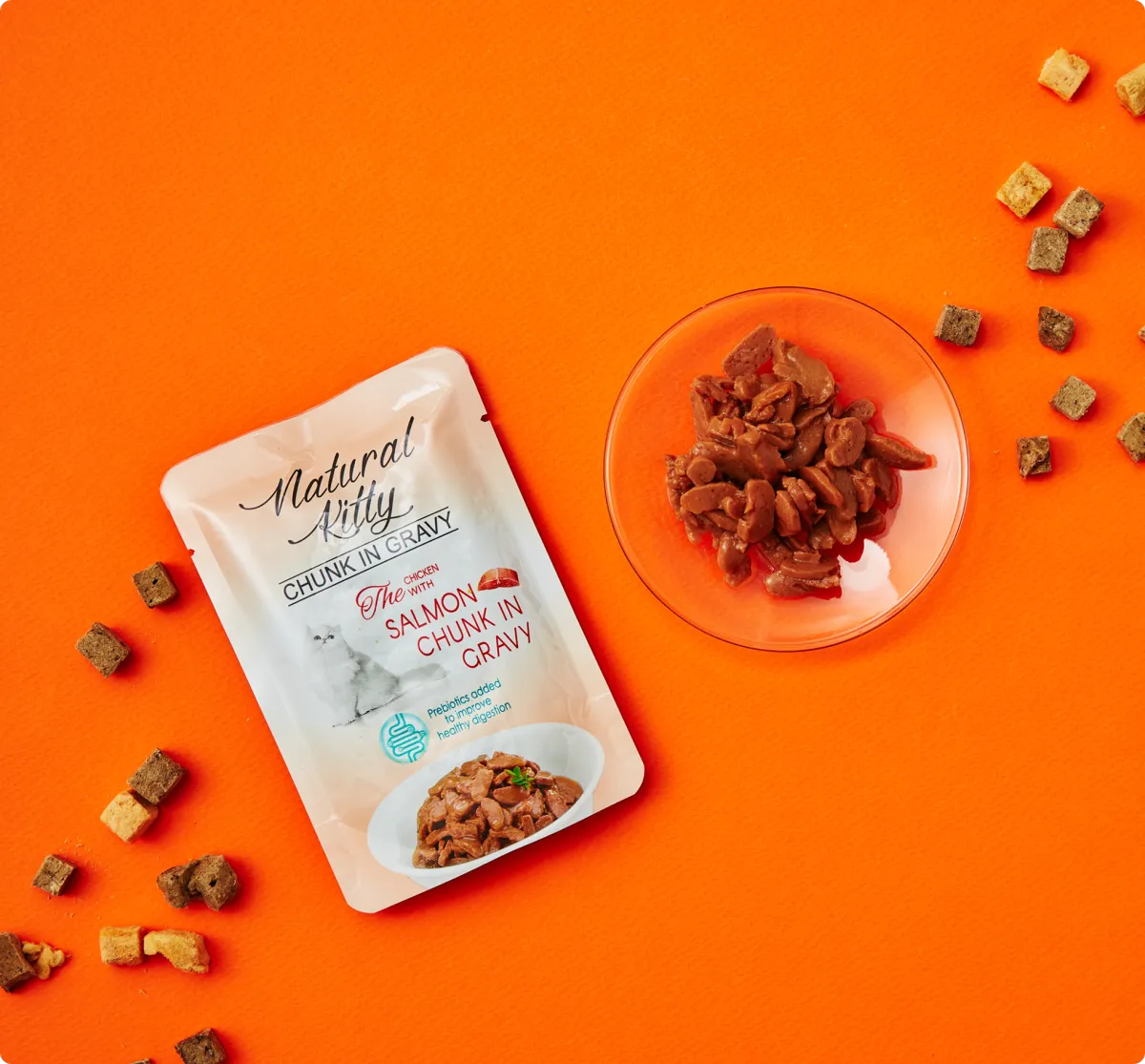 A complete wet food with real chicken and salmon chunks in a delicious sauce. Available in a convenient pouch format.