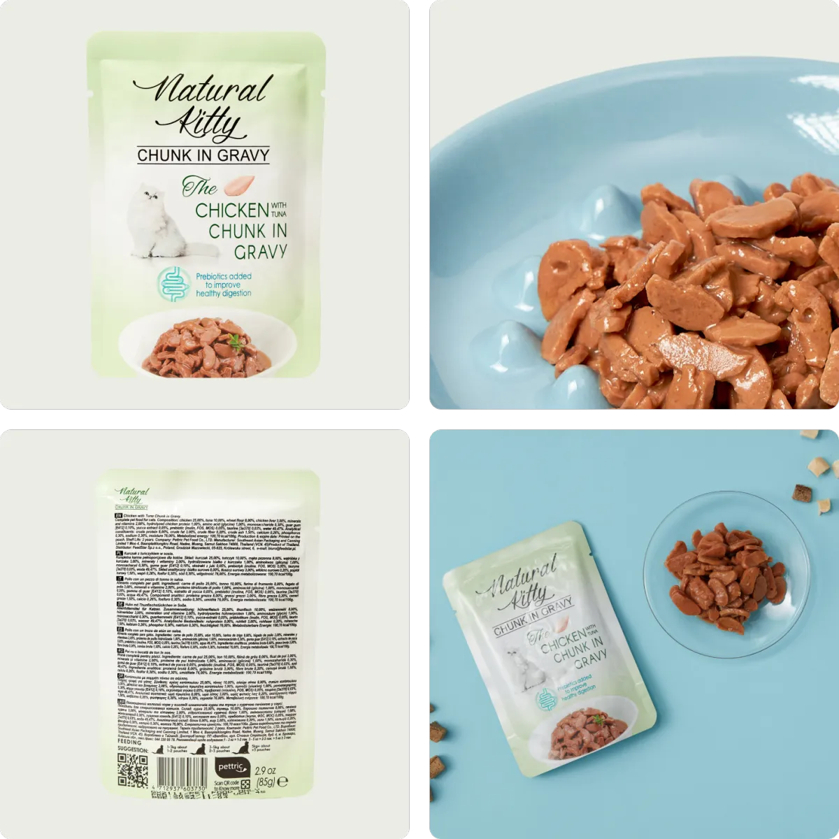 A complete wet food with real chicken and tuna chunks in a delicious sauce. Available in a convenient pouch format.