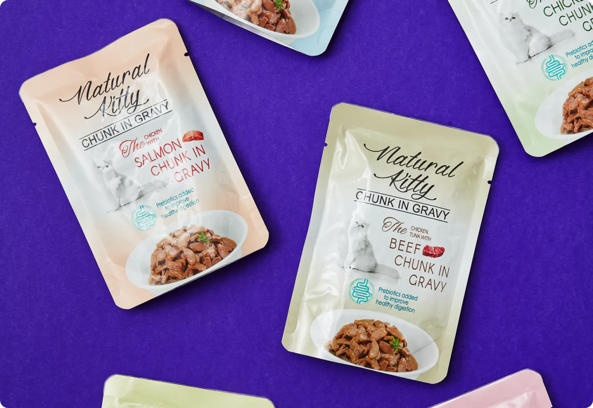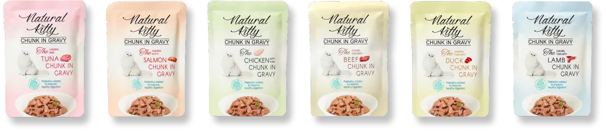 A complete wet food with real chicken, tuna, duck, and chicken liver chunks in a delicious sauce. Available in a convenient pouch format.
