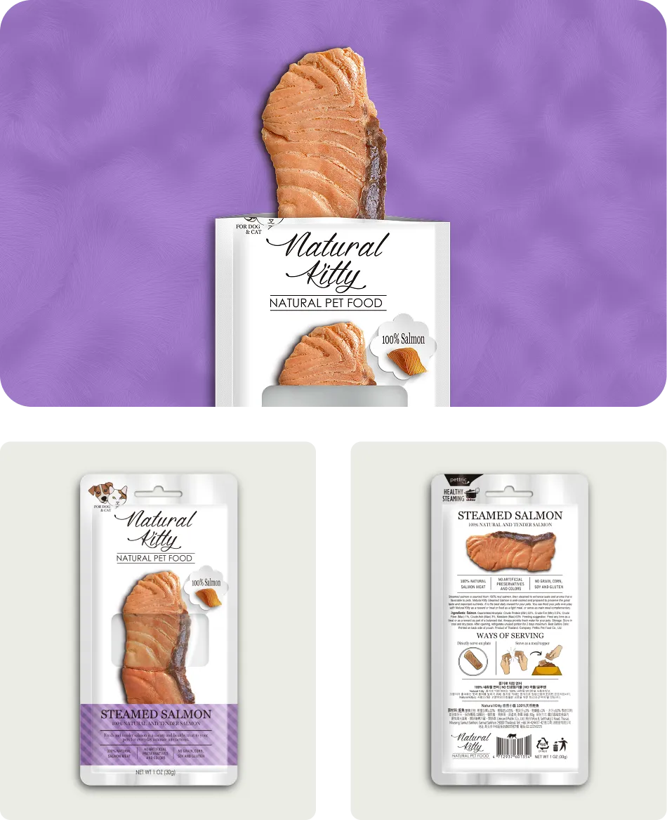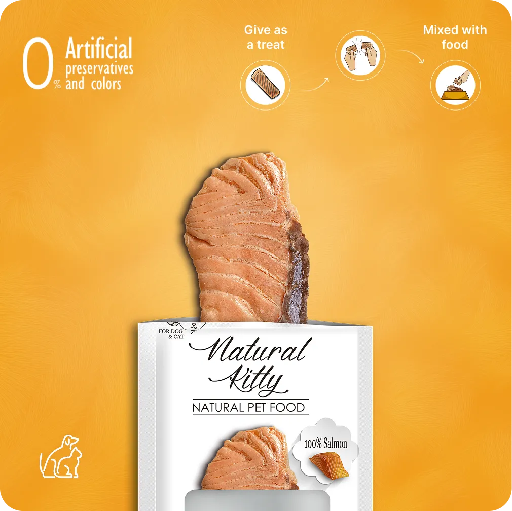 Natural Kitty Salmon Fillet is a natural treat for cats and dogs, made exclusively with salmon. This product is rich in protein, low in fat, fiber, and ash, and provides a high energy value.